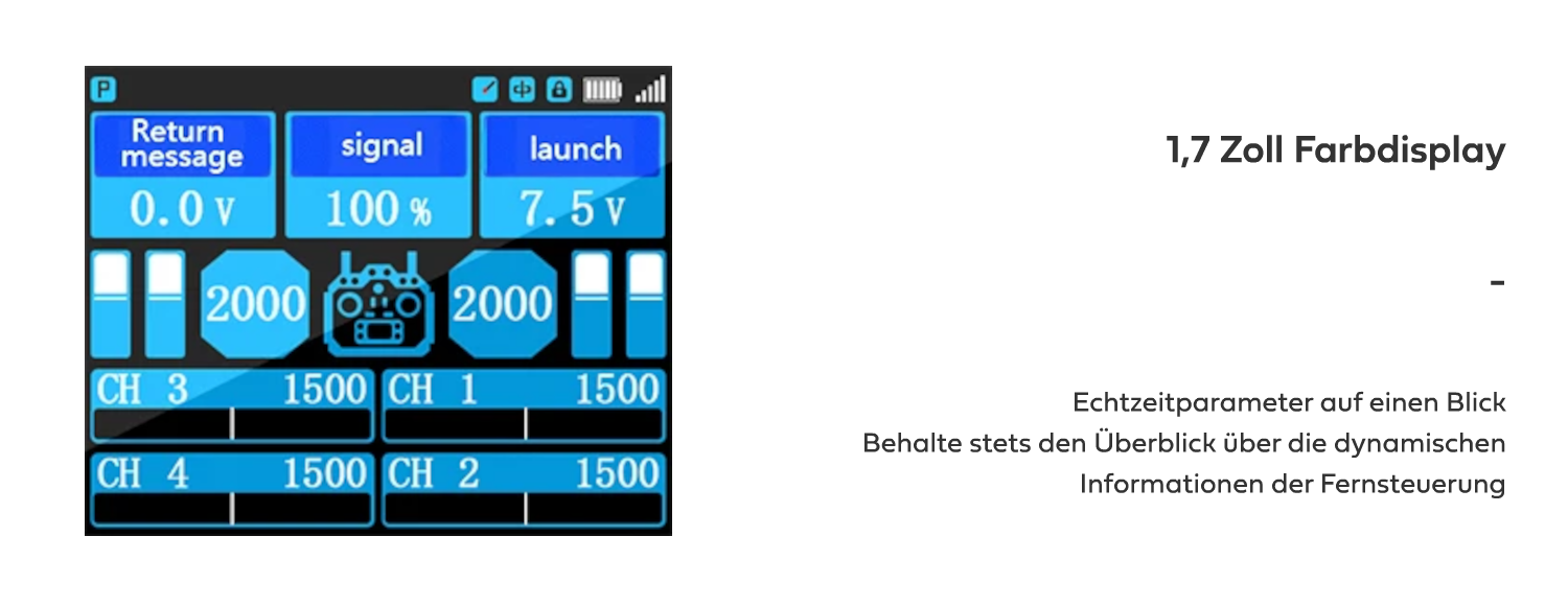 Das 1,7-Zoll-Farbdisplay sorgt für eine klare und intuitive Bedienung. Alle wichtigen Parameter wie Signalstärke, Akkuspannung und Modellinformationen sind jederzeit im Blick. Die integrierte Feedback-Funktion überträgt in Echtzeit die Spannung des Empfängers, während die Alarmfunktion bei niedriger Spannung rechtzeitig warnt – ein Plus an Sicherheit für RC-Modelle.
