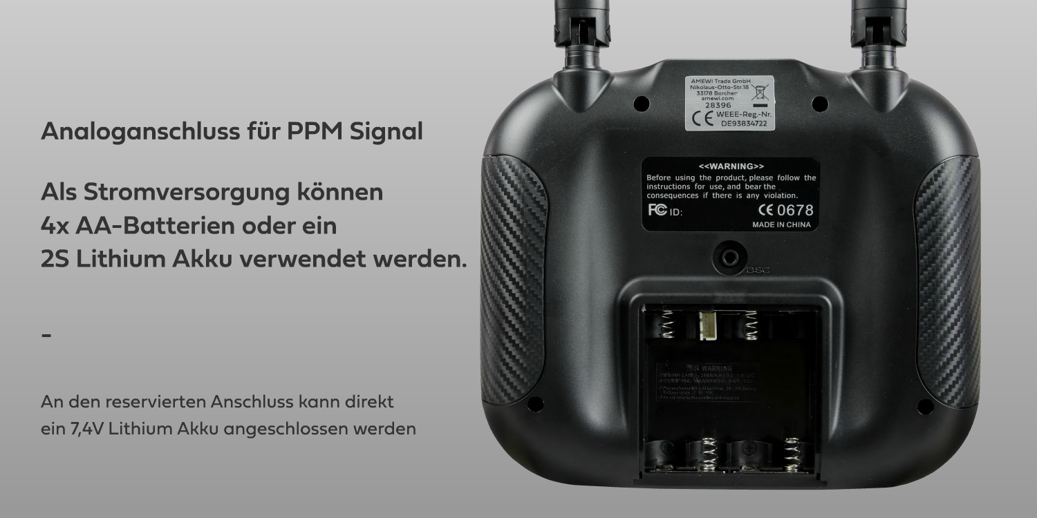 4x 1,5V AA-Batterien oder 2S 7,4V LiPo Akku mit max. Abmessung 57x35x16mm
