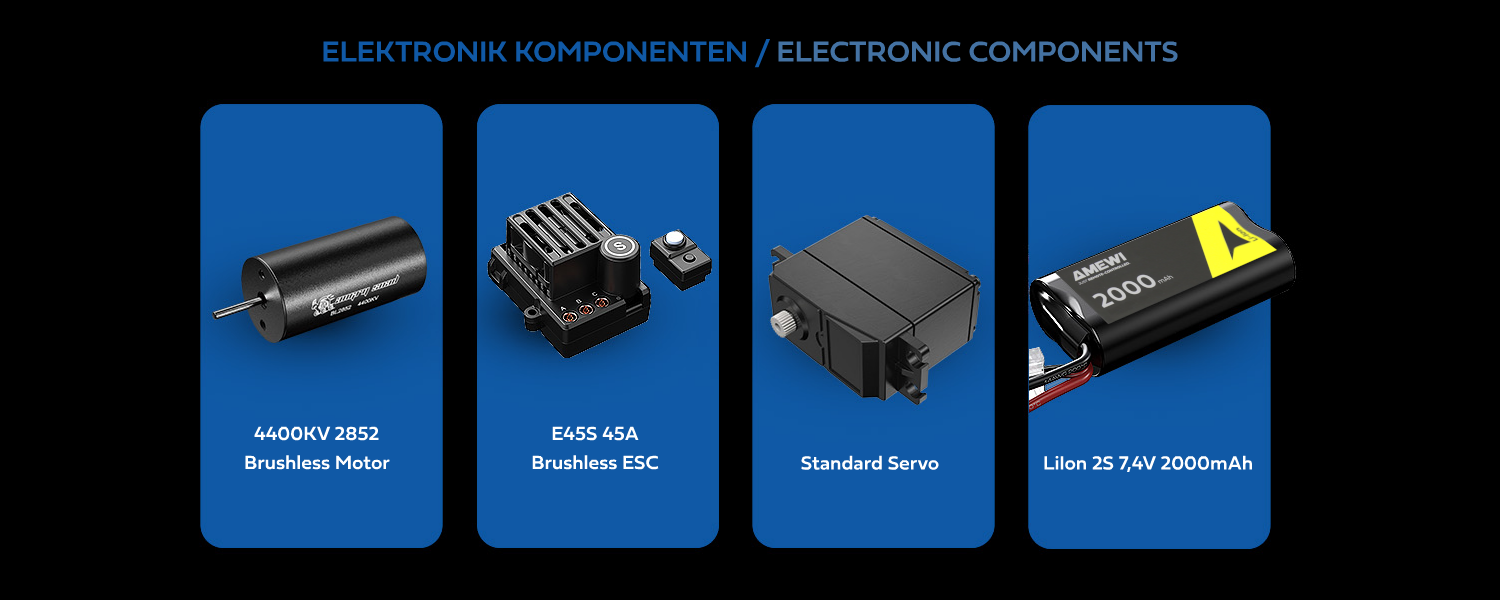 Ein kraftvoller 4WD-Antrieb in Kombination mit dem Brushless-Motor 2852 mit 4400kv und dem neuen 45A V2 Brushless-Regler ermöglicht hohe Beschleunigung und eine Höchstgeschwindigkeit von über 41 km/h. Die moderne 2,4GHz-Fernsteuerung mit Dual Rate für Gas und Lenkung sorgt dabei für präzise Kontrolle. Für den harten Geländeeinsatz ist der Hyper GO MTX14 besonders robust aufgebaut. Wichtige Antriebskomponenten wie Differentiale, Hauptzahnrad und CVD-Antriebswellen bestehen aus Metall und sind auf hohe Belastbarkeit ausgelegt. Zusätzlichen Schutz bieten Metall-Skid-Plates an Front und Heck, die das Chassis versteifen und Beschädigungen reduzieren. Vollständig kugelgelagerte Komponenten gewährleisten einen ruhigen Lauf und eine effiziente Kraftübertragung.Das einstellbare Fahrwerk mit Öldruck-Stoßdämpfern sowie regulierbarem Sturz und Spur erlaubt eine gezielte Anpassung an unterschiedliche Untergründe. Querlenker aus Composite-Vollmaterial sorgen für Stabilität bei geringem Gewicht, während das digitale Lenkservo in Standardgröße eine präzise und schnelle Lenkreaktion ermöglicht. Die schaltbare LED-Beleuchtung an der Front verbessert die Sichtbarkeit bei schlechten Lichtverhältnissen.