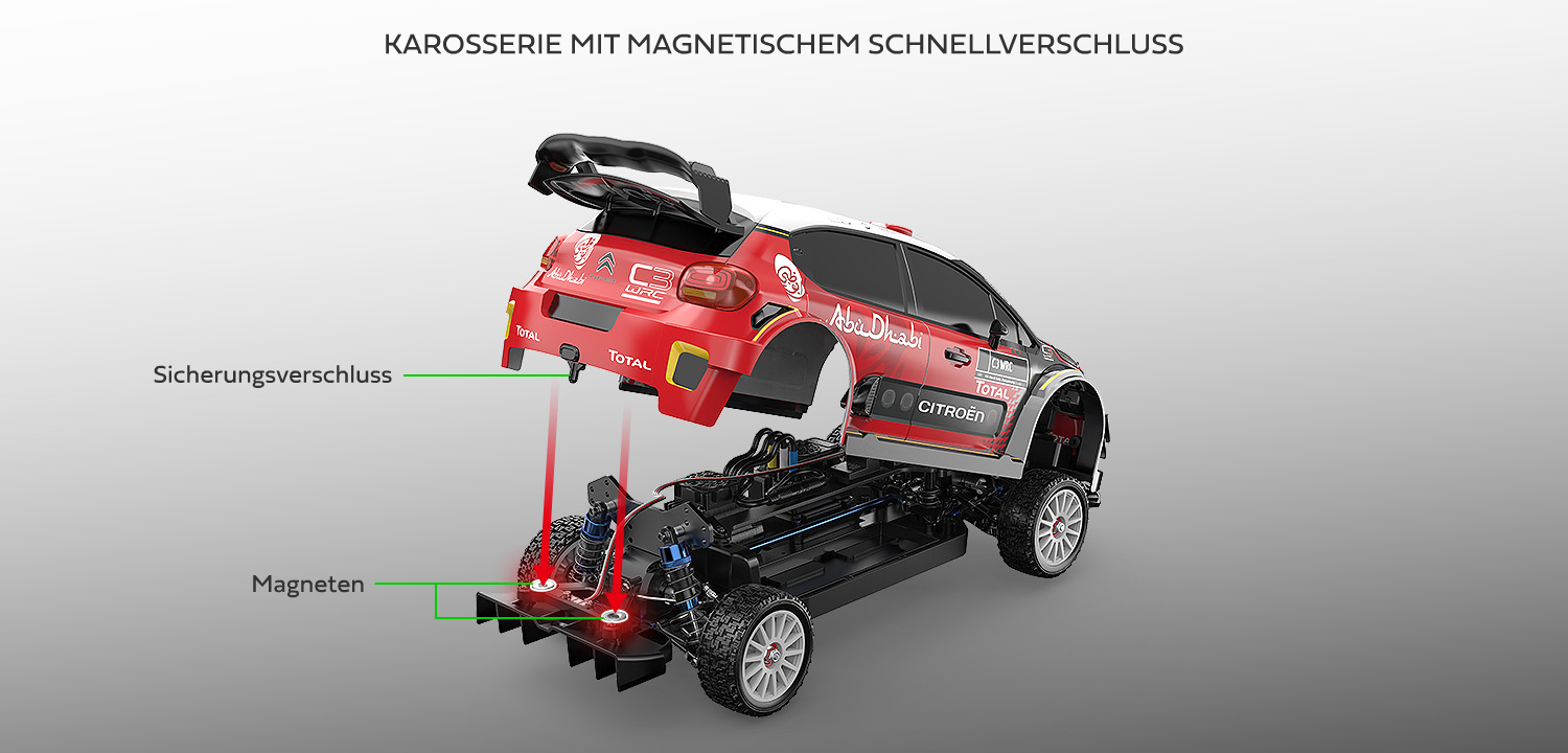 Lizenzierte Citroen C3 WRC Rallye Karosserie mit vielen Details wie beim Original und Magnetverschluss